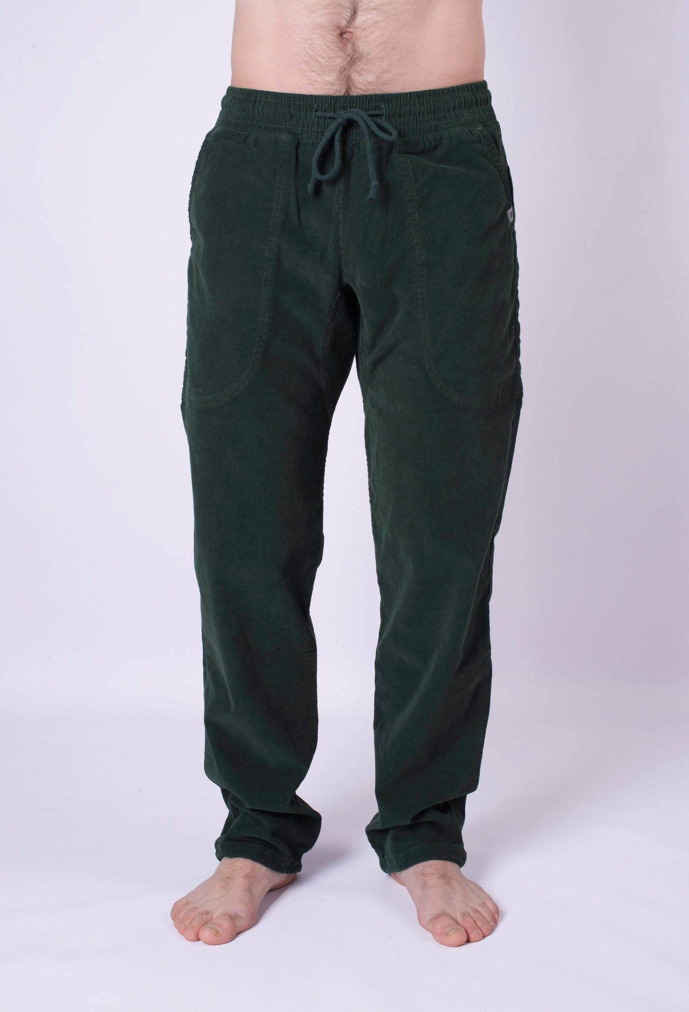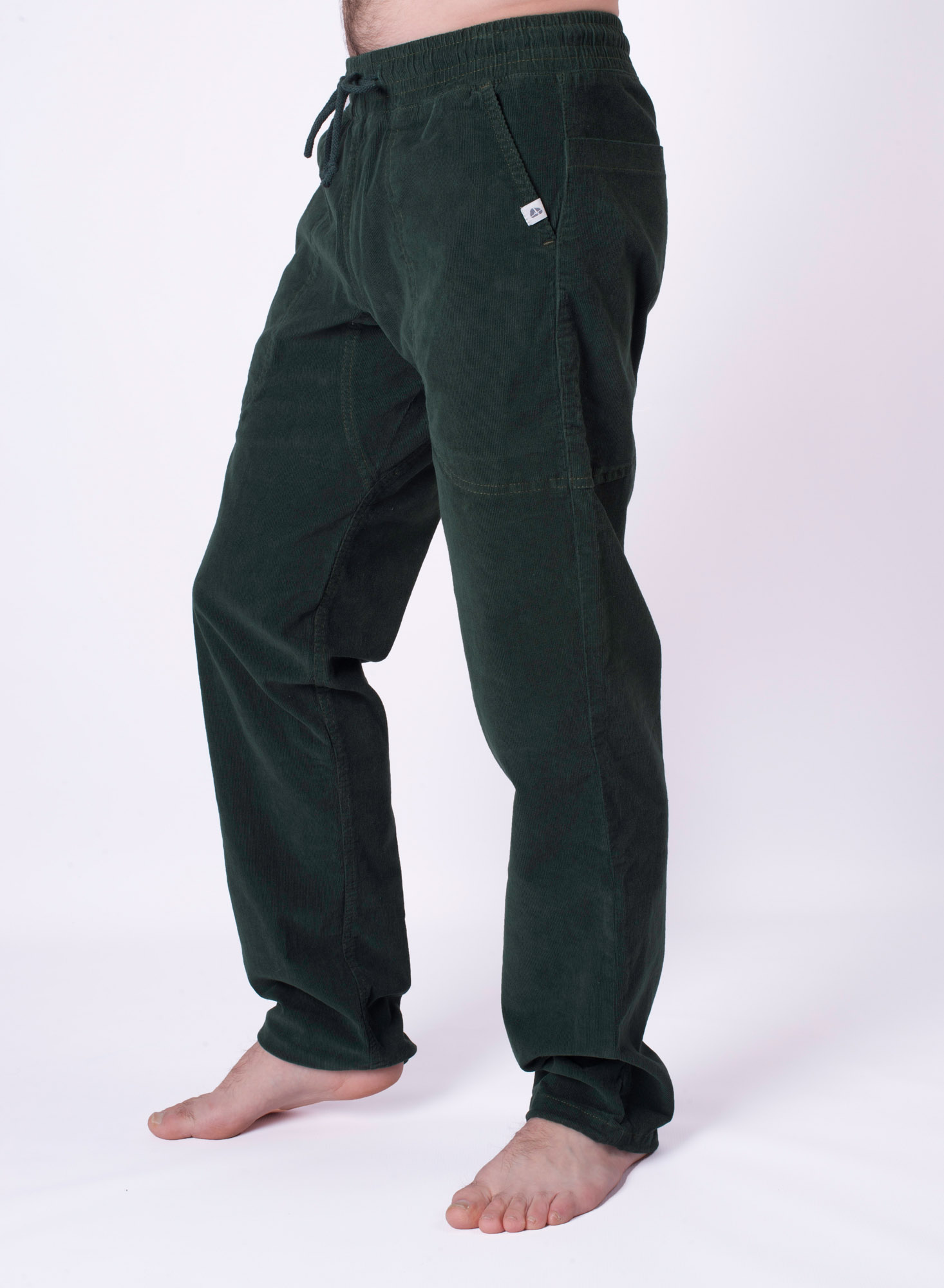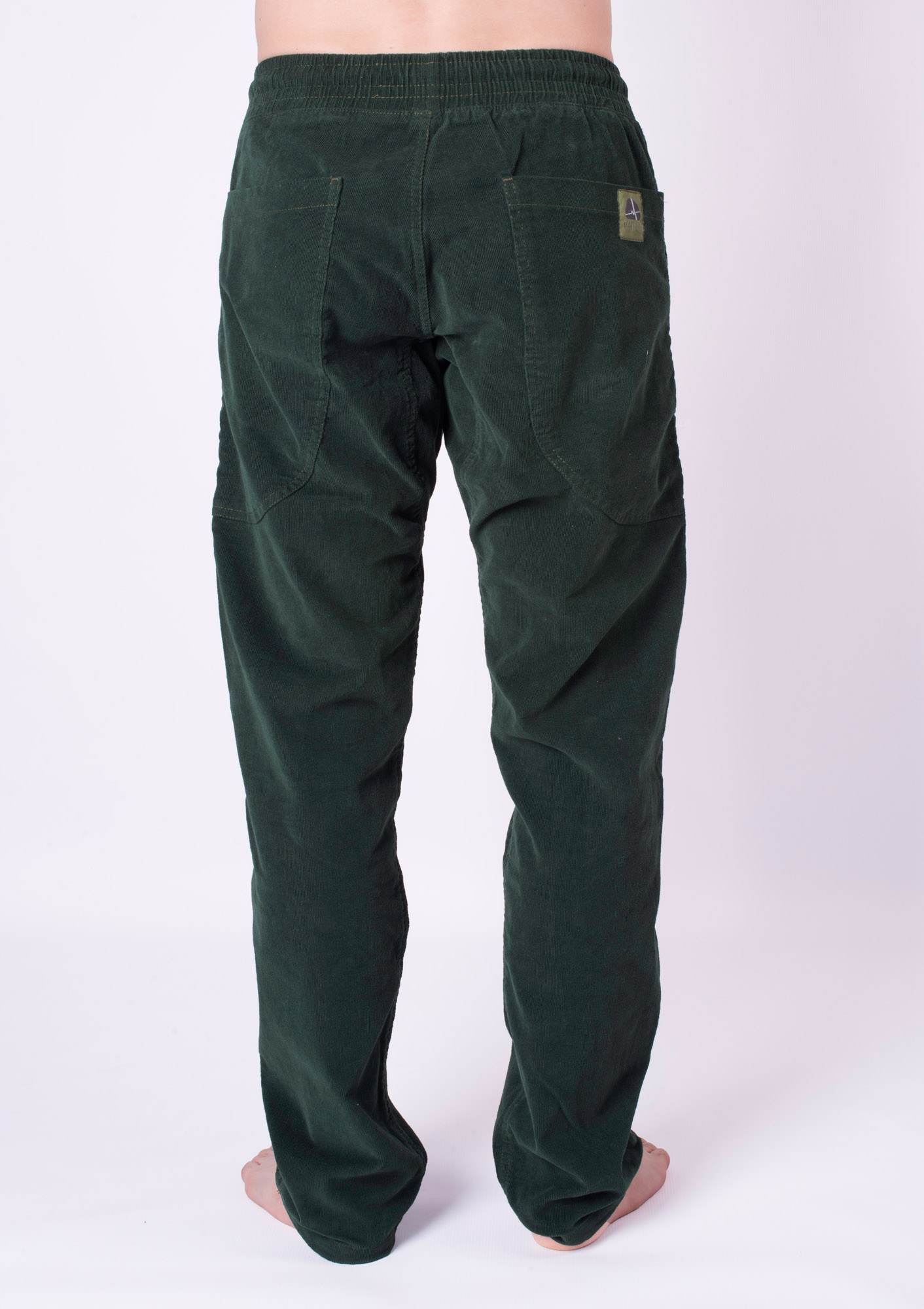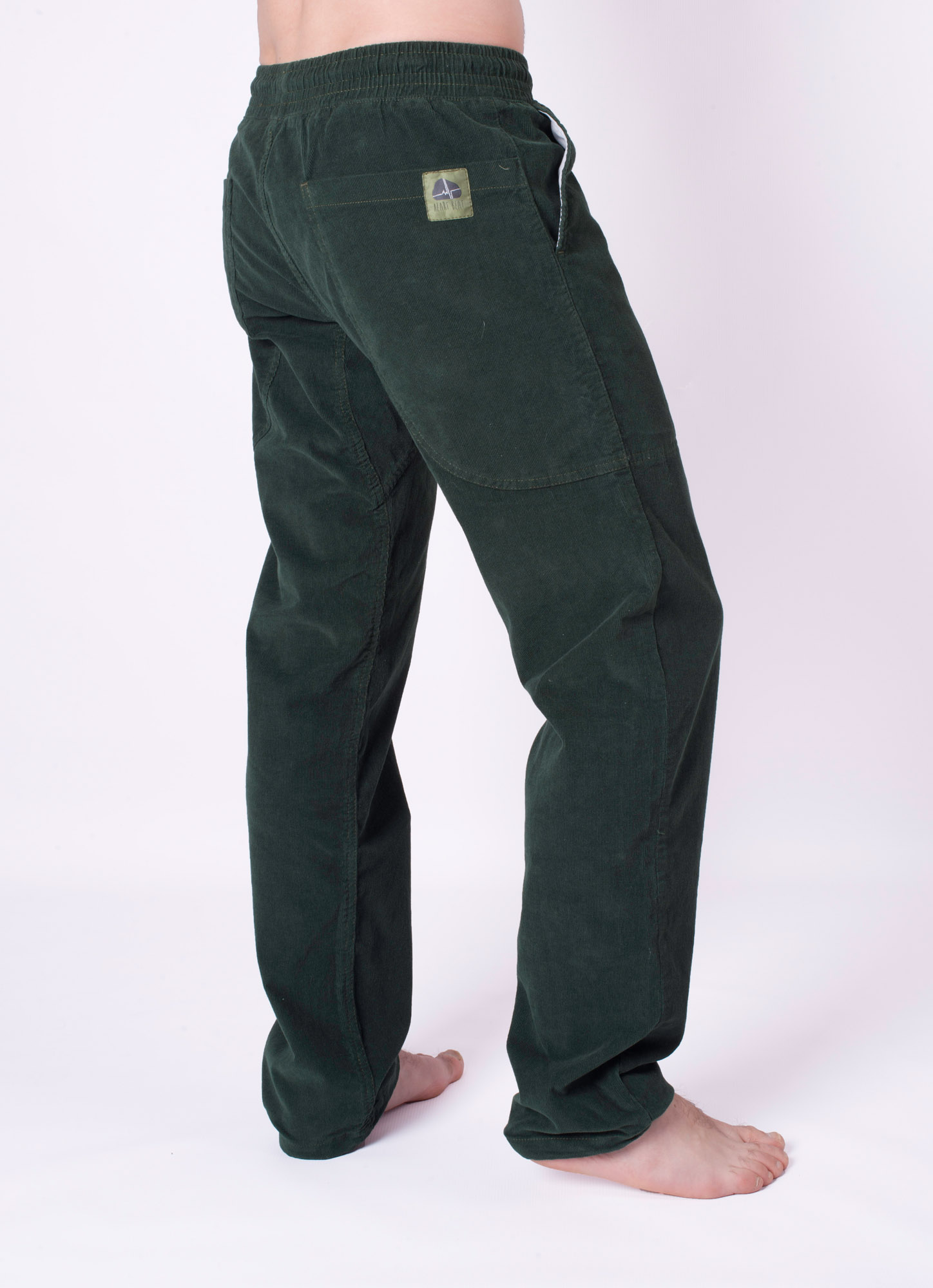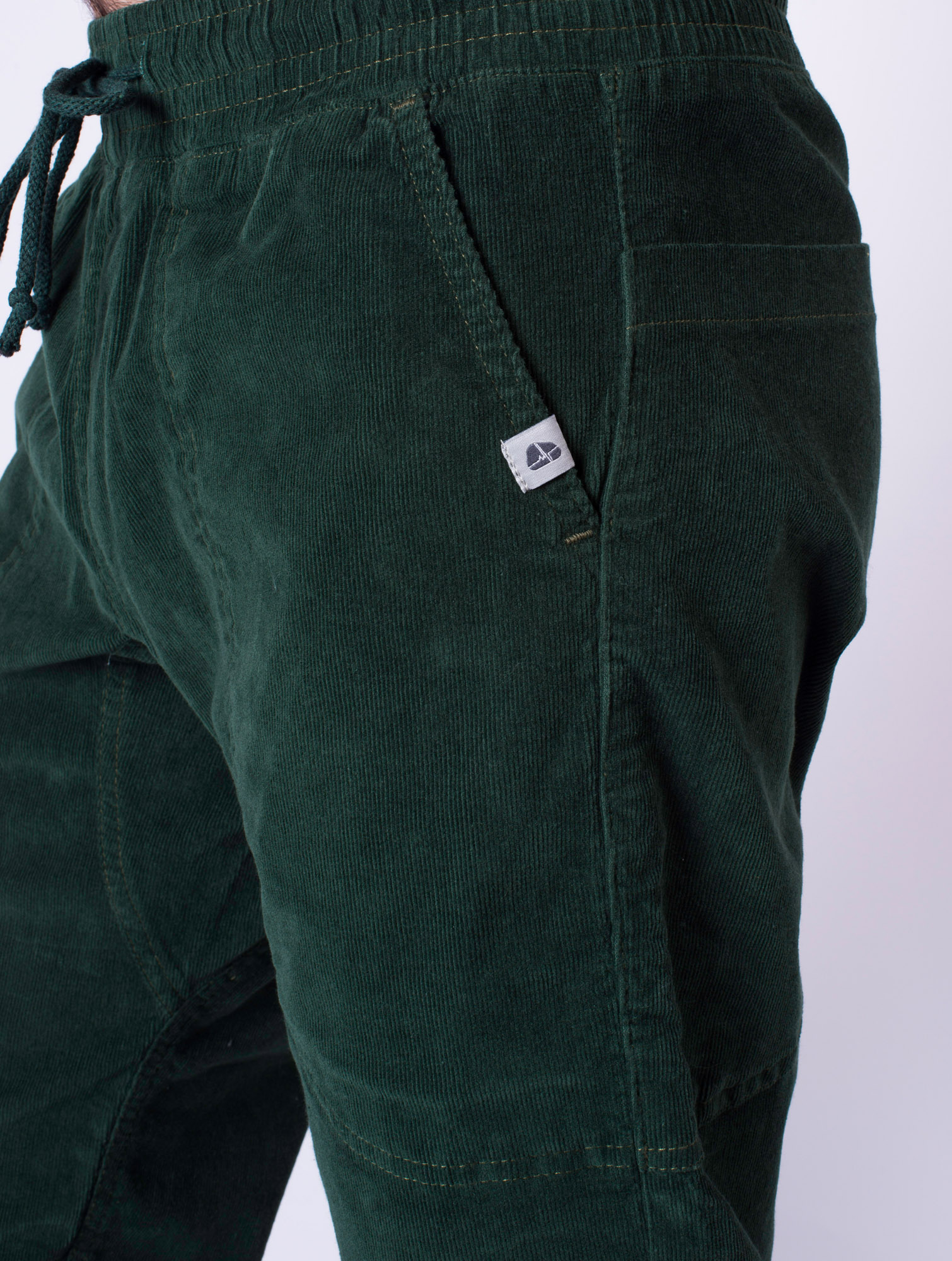Corduroy material with a thin stripe. Big pockets in front and at the back. Diamond crotch. lastic band at waist and additionall drawstring for better adjustment;. Hem with an elastic cord and lock.